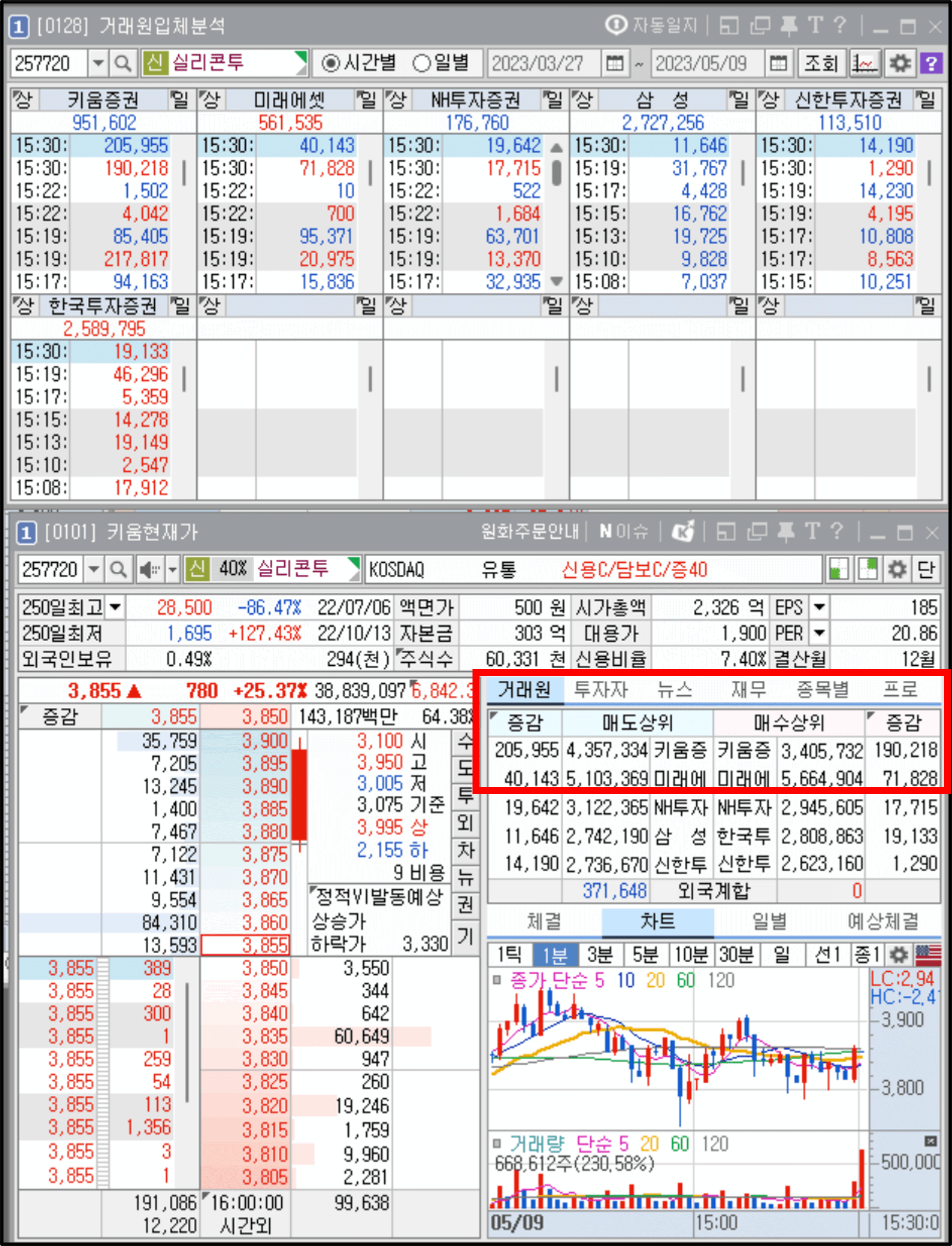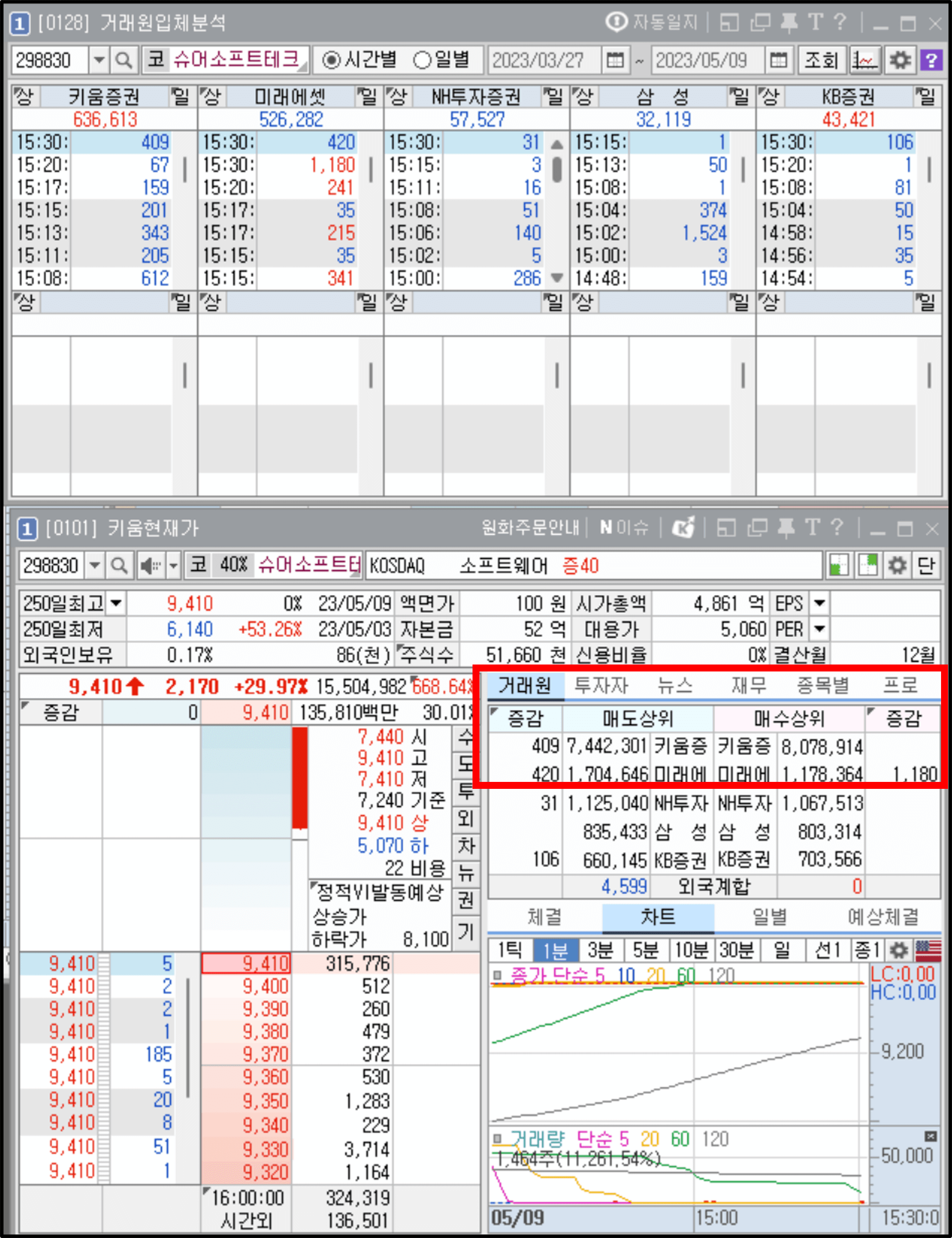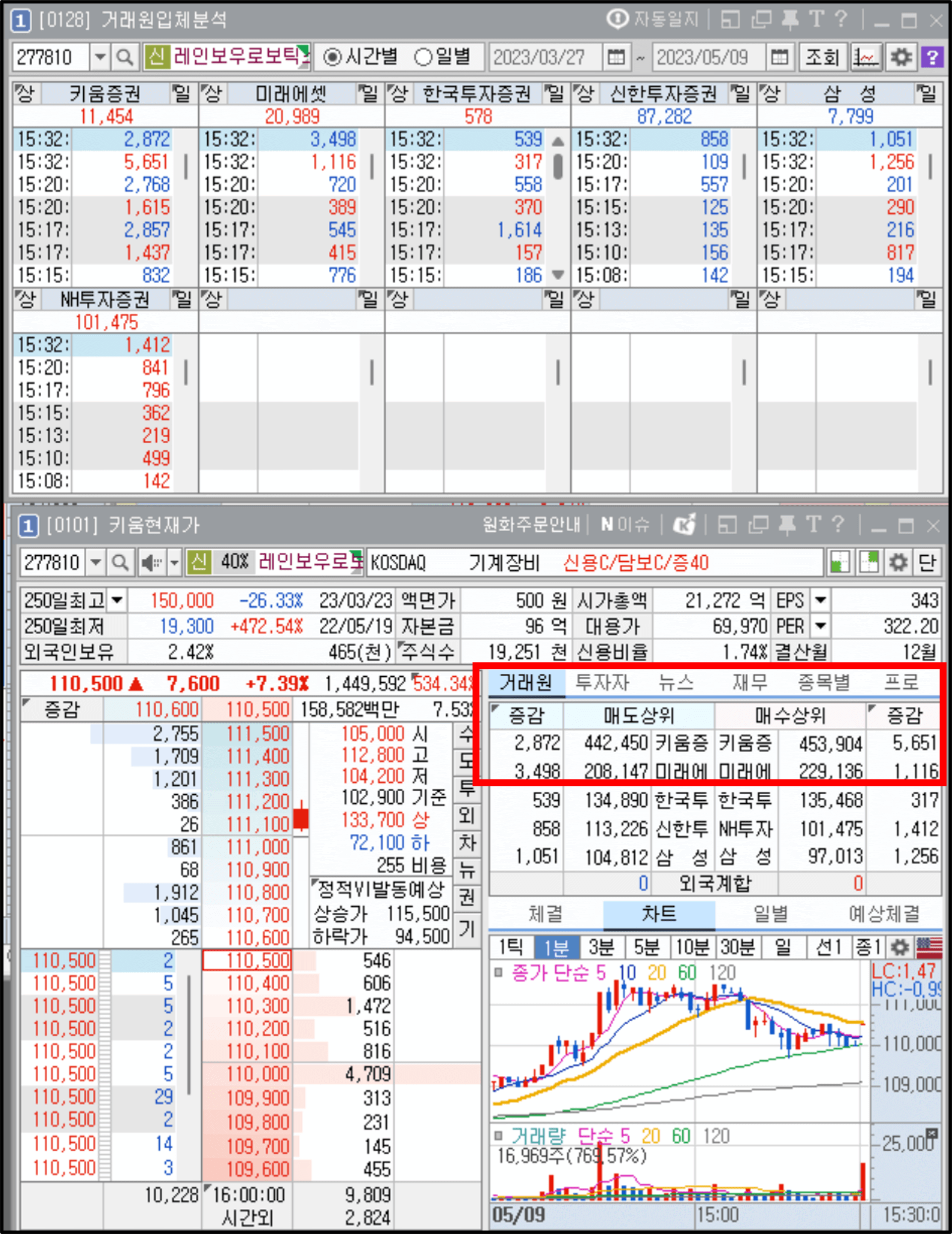 그와 반대로 당일 시장 주도주, 급등주는 외국인, 기관 투자자들도 관심을 가지지만 다수의 투자자 집단 중에서 개인 투자자들에게 가장 큰 관심을 받습니다. 그럼 당일 시장 주도주, 급등주가 개인 투자자들에게 관심을 받을 때 '거래원에서 어떤 특징'이 나타나는지를 확인해보겠습니다.