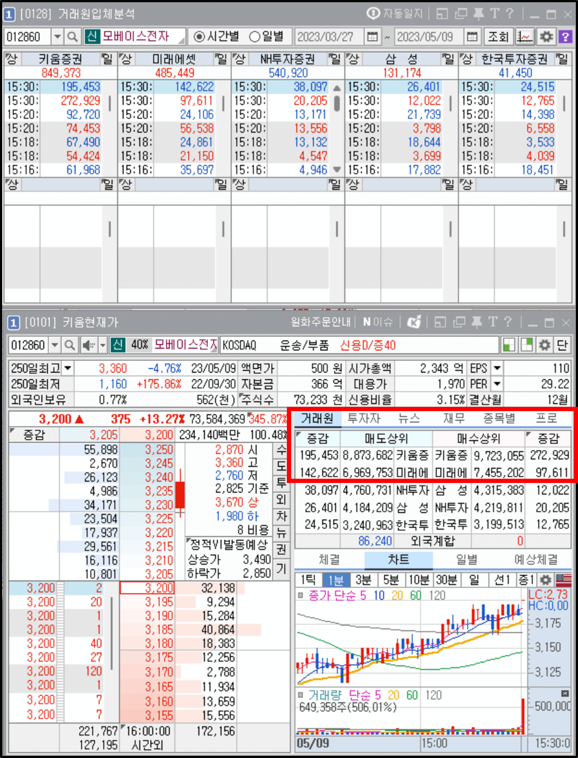 지금 소개해드린 이미지에서 필자가 빨간색 네모 박스로 표기해 둔 구간을 확인해 보시면 모두 '키움증권과 미래에셋증권' 거래원이 매수, 매도 모두 1 ~ 2위에 위치해 있다는 것을 확인하실 수 있습니다.