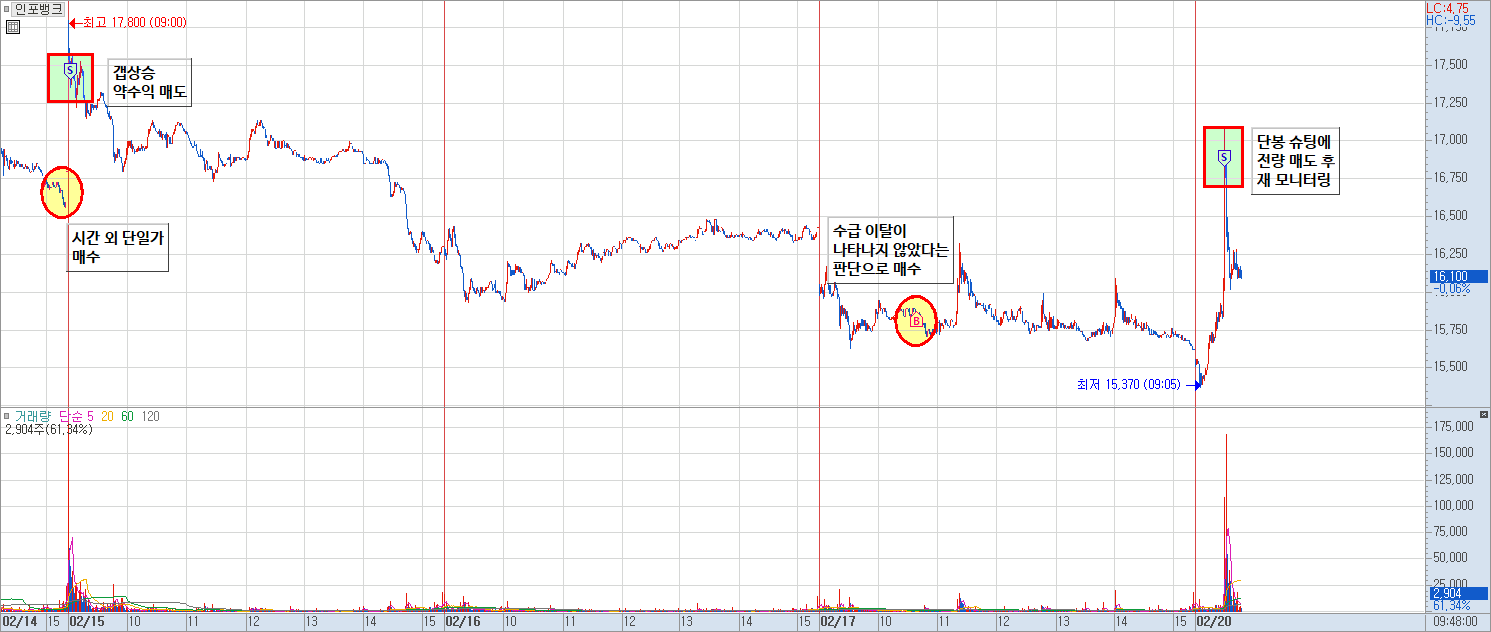 이렇게 필자가 특정 구간에서 단타 매매를 하는 것, 또 특정 구간에서 데이트레이딩 ~ 스윙 매매를 하는 것은 모두 해당 종목들을 관심종목에 저장해 두고 흐름을 모니터링하고 있었기 때문에 가능했던 매매들입니다. 과거 필자가 소니드를 매매했던 사례, 인포뱅크를 매매했던 사례도 간략하게 살펴보실 수 있도록 일지 차트를 보여드리겠습니다.