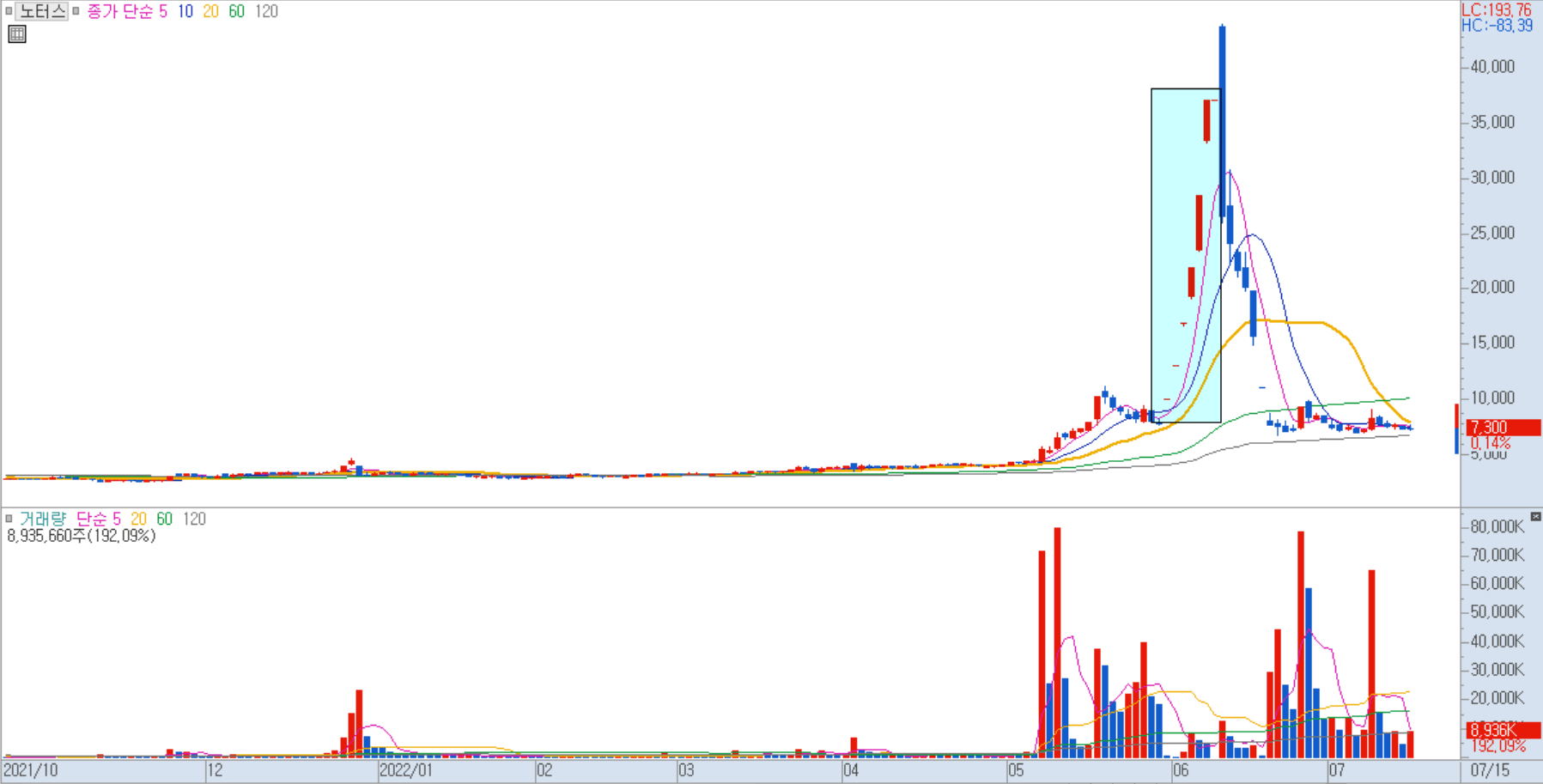 2022년에 최초로 800% 비율의 무상증자 공시를 발행한 기업은 노터스입니다. 노터스는 무상증자 공시를 발표한 시점부터 대략 1000% 가까이 주가가 상승하는 흐름이 나타났으며 이런 흐름을 예측하고 매매를 한 투자자들은 아마 거의 없을 것이라고 생각합니다.
