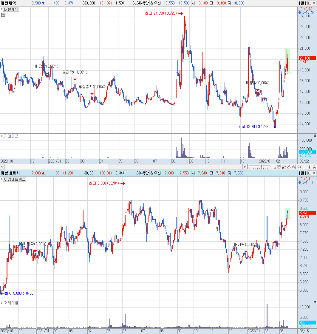 예시 이미지 상단에 있는 종목은 대원제약이며 하단에 있는 종목은 이상네트웍스입니다. 두 가지 종목의 차트를 보시면 종가 기준으로 대원제약은 약 2.81% 상승이 나타났고 이상네트웍스는 2.07%의 상승이 나타났습니다. 평소 우리가 생각하던 무상증자의 흐름과 비교했을 때는 굉장히 작은 모습의 상승이 나타난 것을 쉽게 확인하실 수 있습니다.