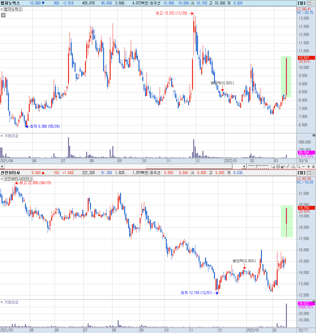 위 예시 이미지에서 상단에 있는 종목은 랩지노믹스이며 하단에 있는 종목은 선진뷰티사이언스라는 종목입니다. 두 종목 모두 무상증자 공시 발표를 한 후 상한가에 들어가는 흐름을 보여주었으며 두 종목 모두 1 : 1 이상의 비율로 무상증자를 실시한다는 공시를 발표한 것을 어렵지 않게 확인하실 수 있습니다.