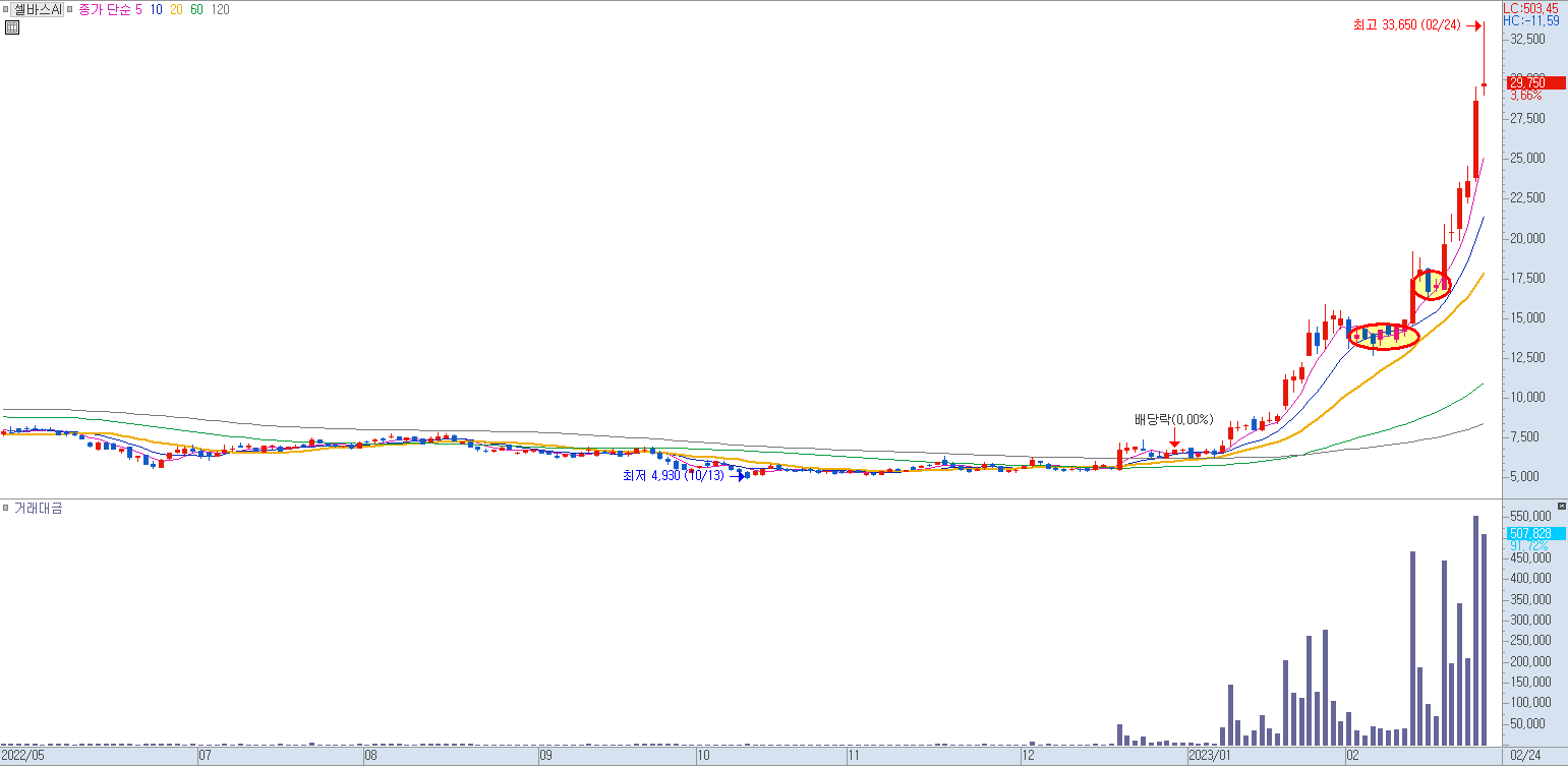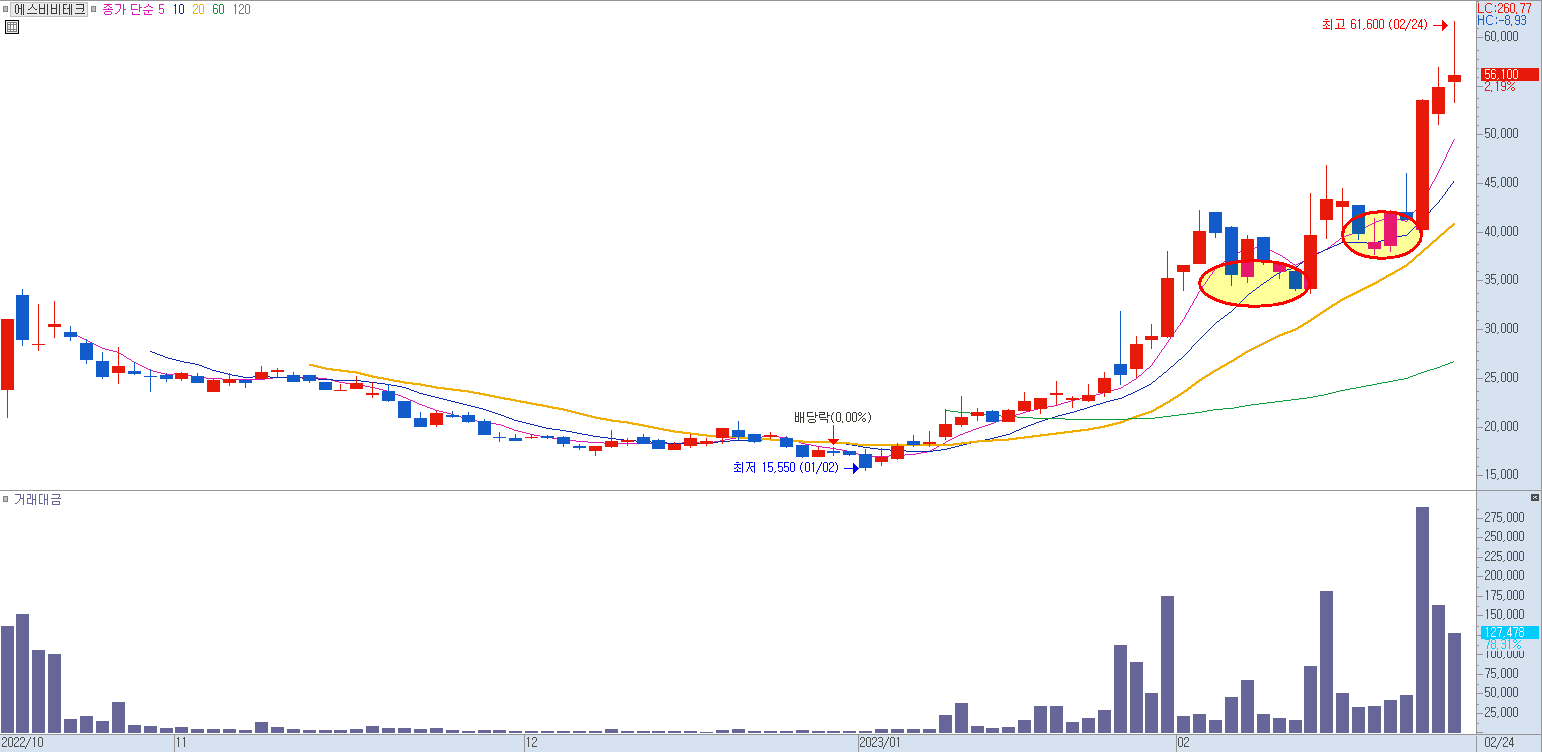 위 차트를 살펴보실 때에는 두 가지 포인트에 집중해주시면 되는데, 첫 번째는 거래대금입니다. 거래대금이 기본적으로 1000억 이상 발생하며 눈에 띄게 증가하는 구간에서는 3000억 ~ 5000억의 거래대금이 발생하기도 합니다. 즉, 이슈가 되는 테마에 편입된 종목들은 항상 투자자들이 지켜보고 있기 때문에 언제든 수급이 몰릴 수 있다는 특징이 있습니다.