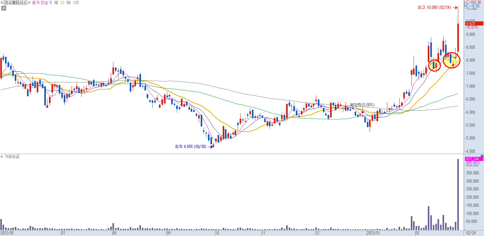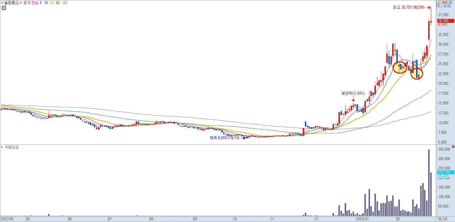 또 위와 같이 수급이 몰리는 테마에 편입된 종목들은 단기간에 주가가 하락하더라도 다시 반등할 가능성이 높다는 것이 두 번째 포인트입니다. 필자가 차트에 동그라미로 표기해 둔 구간은 눌림목으로 볼 수 있는 구간이며, 투자자들이 종목을 손절하지 못했을 때 공포심이 작용할 수 있는 구간입니다.
