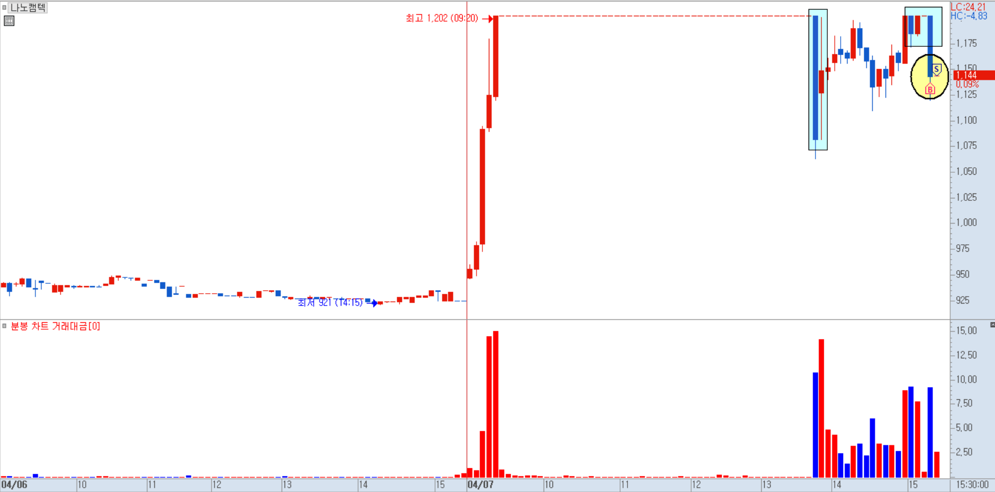 필자는 보통 위와 같은 흐름에서 U, V자 모습으로 반등하는 흐름이 보이면 매매에 참여하기도 하는데 금일은 매매에 참여하기가 어려웠던 날이라 장 막판에 한국ANKOR유전의 주가가 상한가가 풀리는 흐름에서 단타 매매를 했고, 이후에는 나노캠텍의 주가가 크게 하락했을 때 매수한 뒤 종가에 전량 매도하면서 매매를 마쳤습니다.