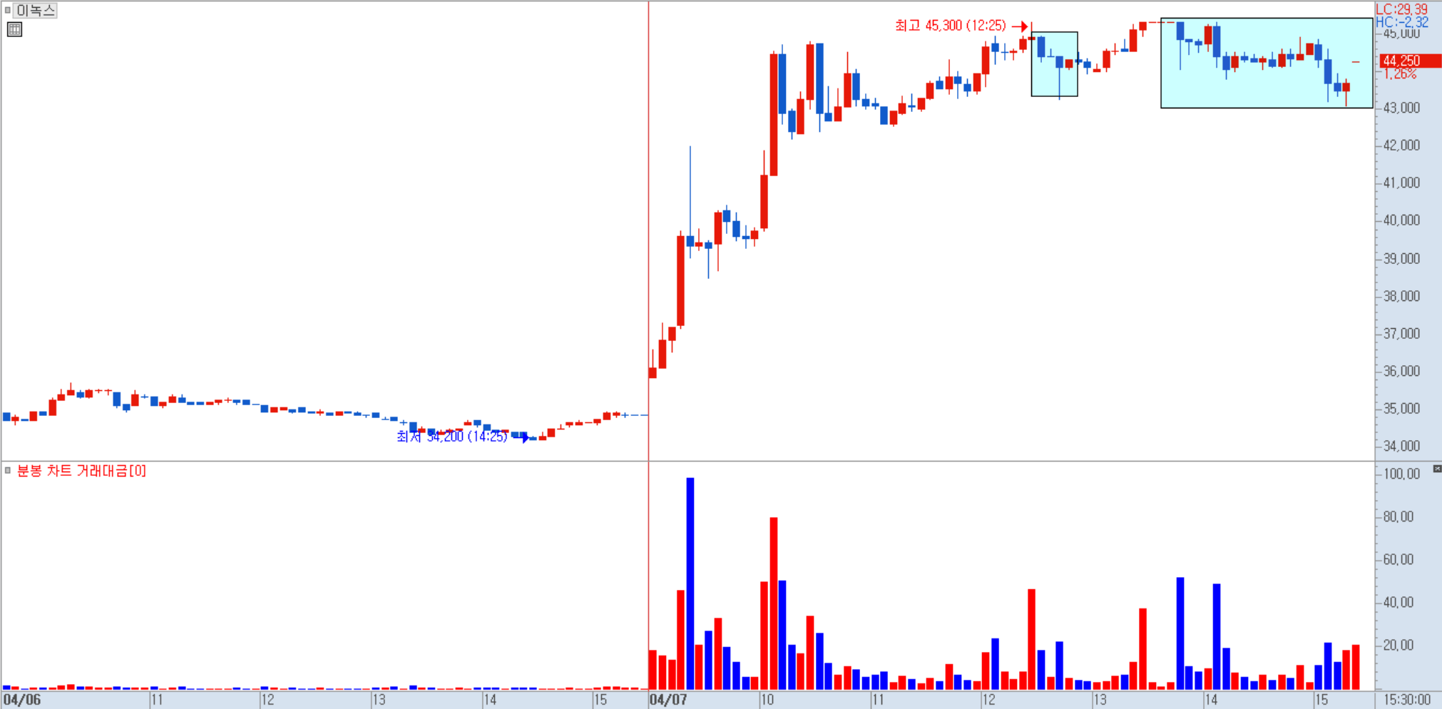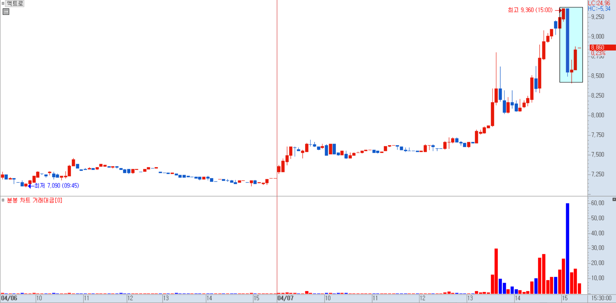 위 차트는 스카이문스테크놀로지의 분봉 차트입니다. 해당 차트를 보시면 상한가 기준, 고점 대비 약 -35% 정도 주가가 하락했으며 상따 매매를 했는데 손절을 하지 못했다면 예수금의 30%가 한순간에 날아갔다고 볼 수 있습니다.