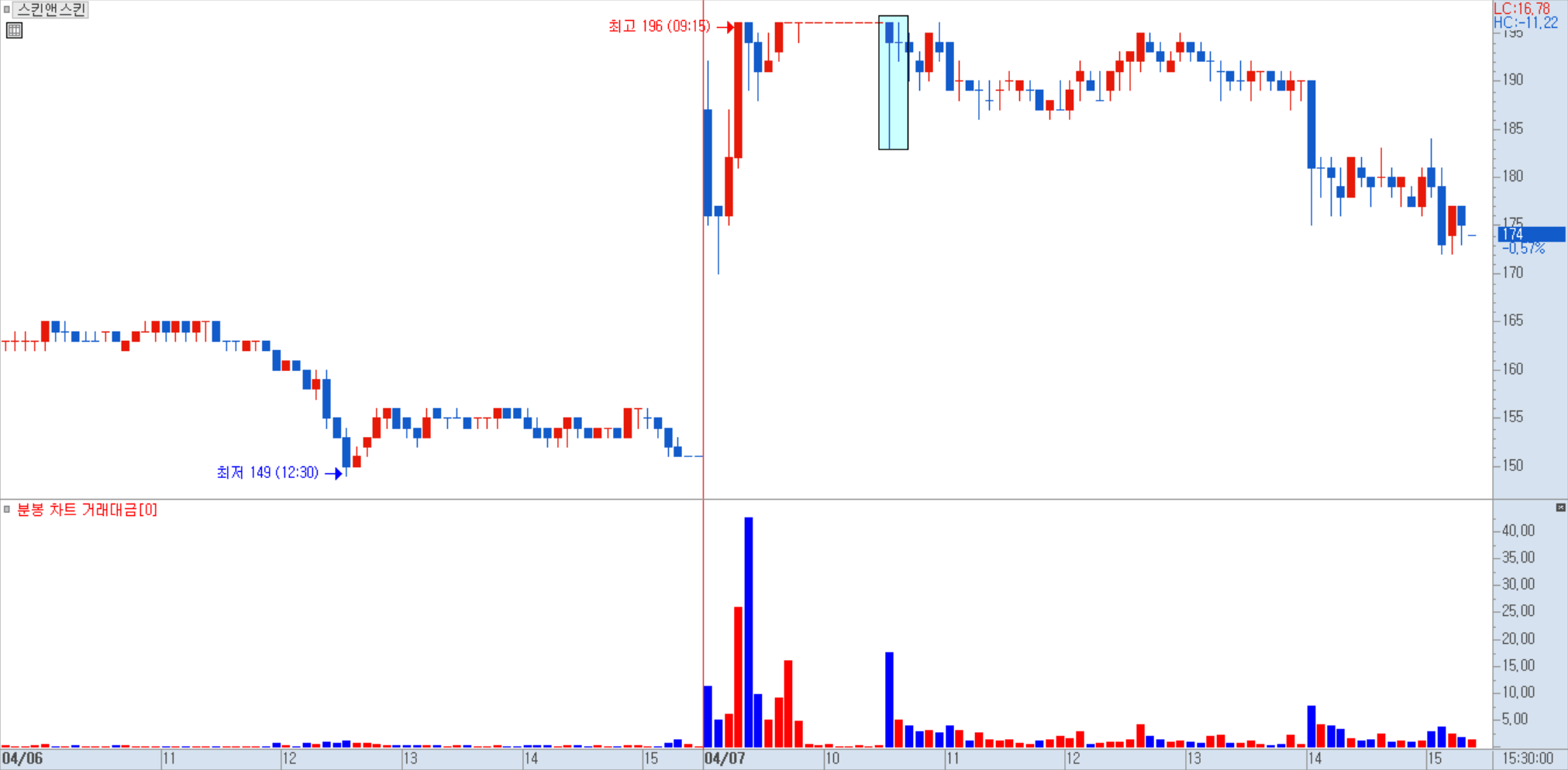 위 차트는 스카이문스테크놀로지의 분봉 차트입니다. 해당 차트를 보시면 상한가 기준, 고점 대비 약 -35% 정도 주가가 하락했으며 상따 매매를 했는데 손절을 하지 못했다면 예수금의 30%가 한순간에 날아갔다고 볼 수 있습니다.