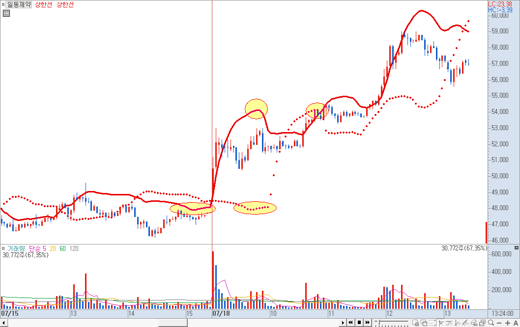 위 예시는 분봉 차트 위에 볼린저밴드 지표를 두 가지 설정해 둔 것입니다. 일반적인 빨간색 보조지표는 기본적인 볼린저밴드의 상한선이며 점선으로 되어 있는 빨간색 보조지표는 볼린저밴드를 우측으로 이동시켜 둔 것입니다.