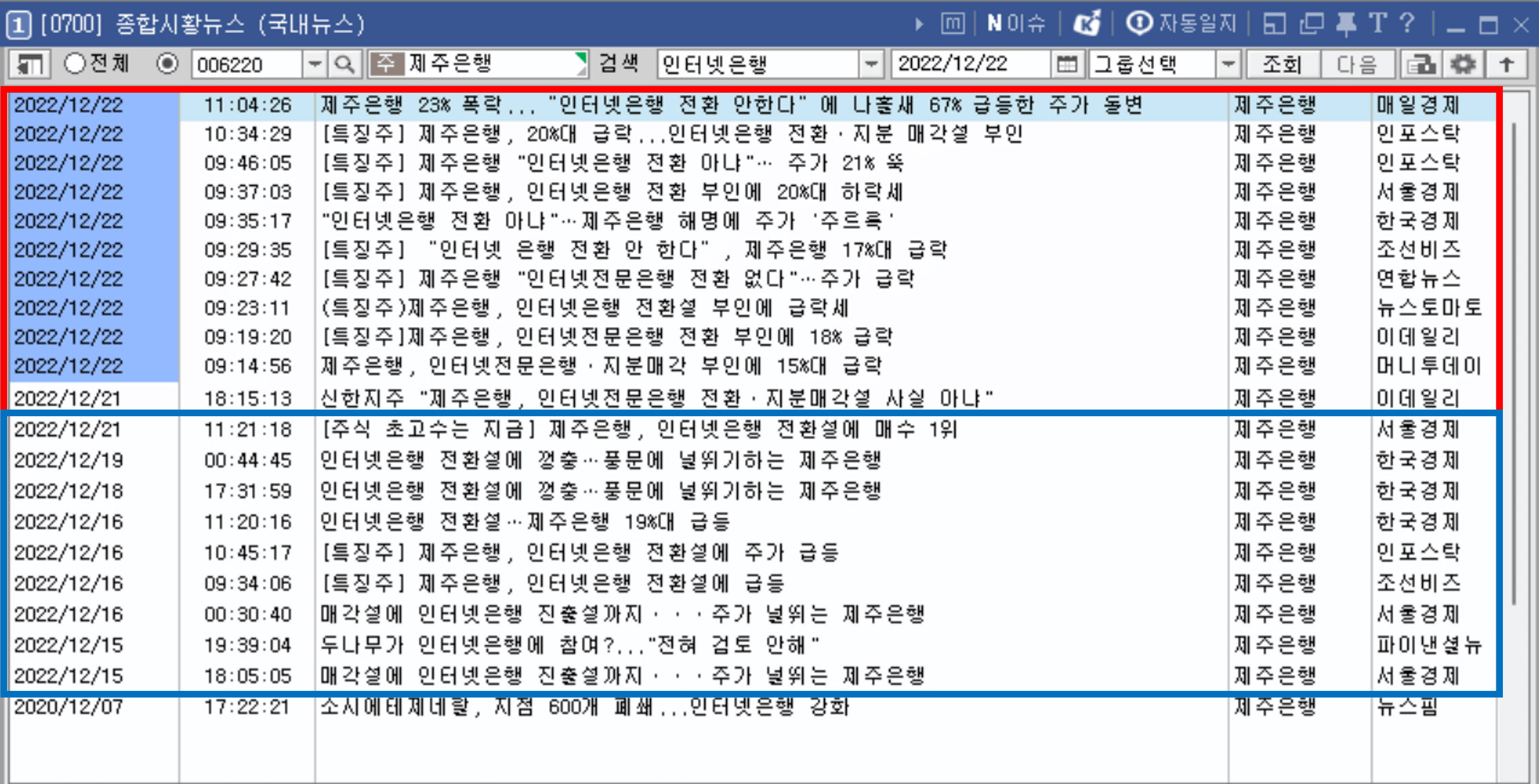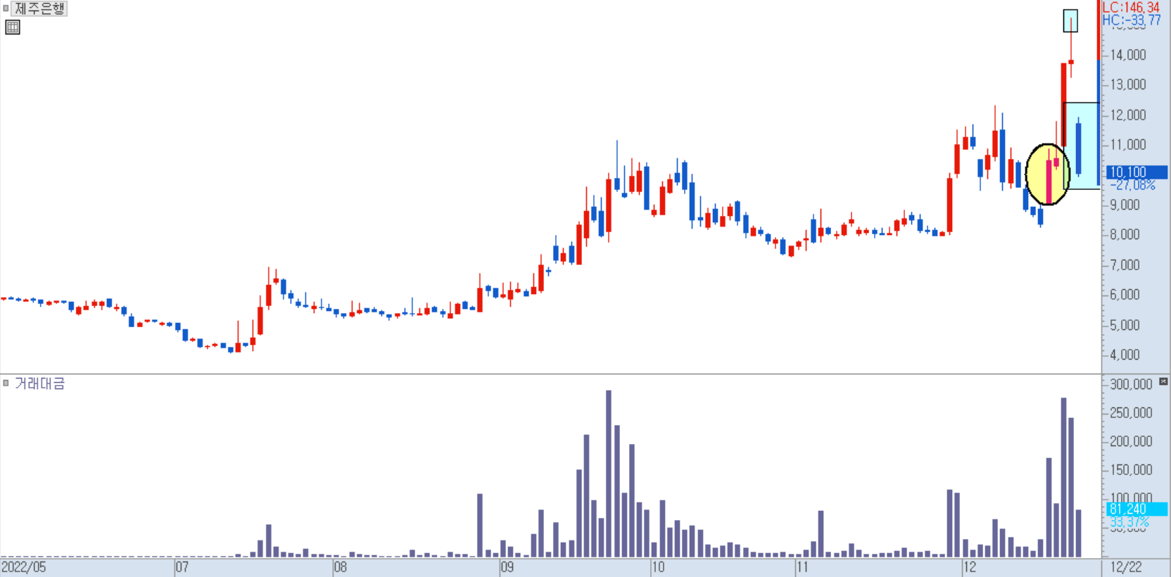 위 뉴스와 차트를 보시면 2022년 12월 15일부터 제주은행에 관련된 재료가 발생했다는 것과 그때부터 주가가 가파르게 상승했다는 것을 확인하실 수 있습니다. 그런데 갑자기 2022년 12월 22일에 제주은행과 관련된 재료 소멸 뉴스가 보도되면서 주가가 -25% 이상 하락한 흐름이 나타난 것까지 확인하실 수 있습니다.