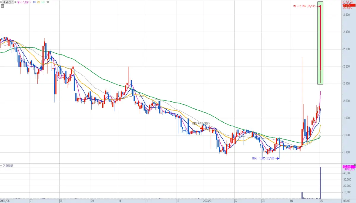 위 예시는 과거 계양전기의 일봉 차트입니다. 여러 가지 종목들을 살펴보다가 포스팅 작성을 위해서 '갭이 크게 뜬 종목의 차트를 임의로 캡처'해 둔 것입니다.
