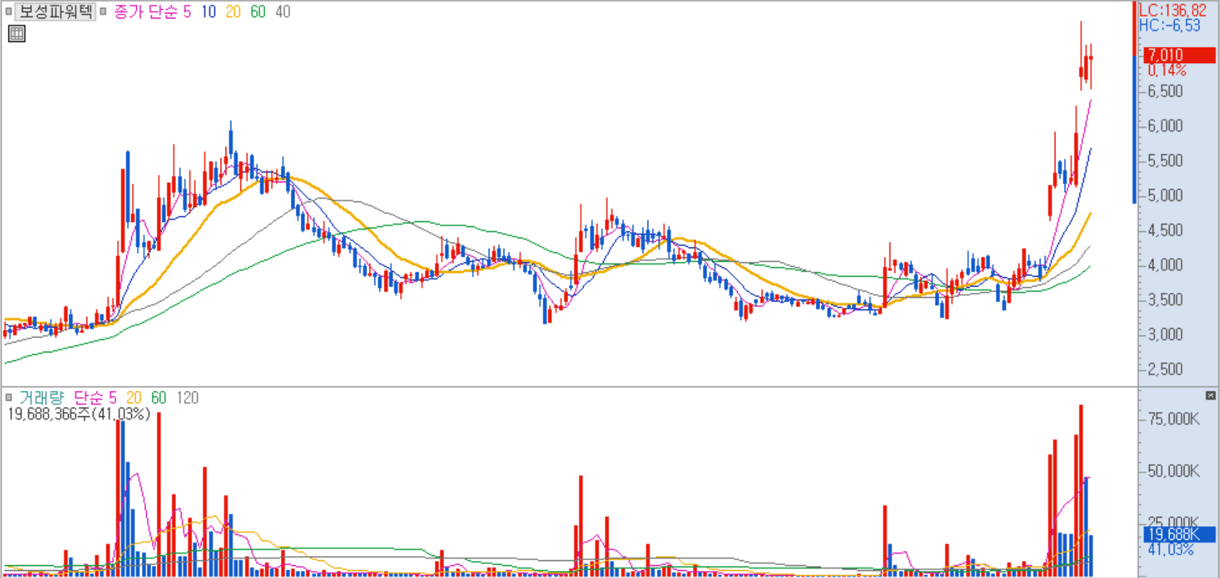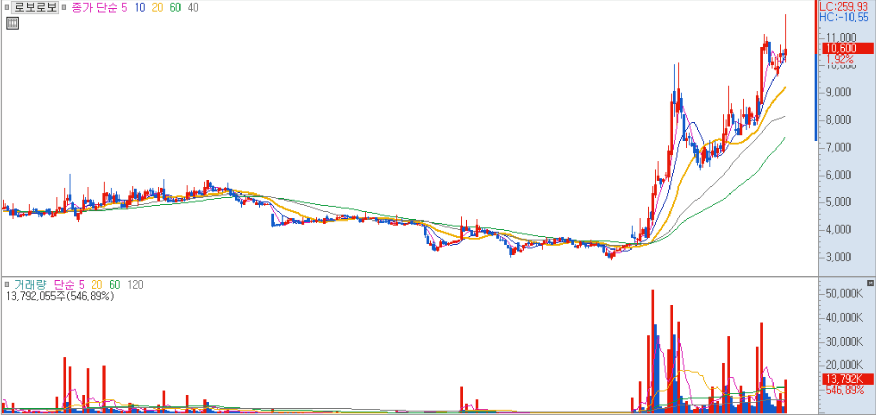 위 차트 예시 이미지는 보성파워텍과 로보로보의 일봉 차트 예시 이미지입니다. 위 두 종목은 테마주의 성격을 가지고 있는 종목들인데 위에서 보여드린 삼성전자와 엔씨소프트가 100%가 조금 넘는 상승이 나타났다면 위 종목들은 100 ~ 200% 이상 오르는데 기간이 오래 걸리지도 않고 변동성이 하루에도 정말 크게 나타나는 것을 확인하실 수 있습니다.