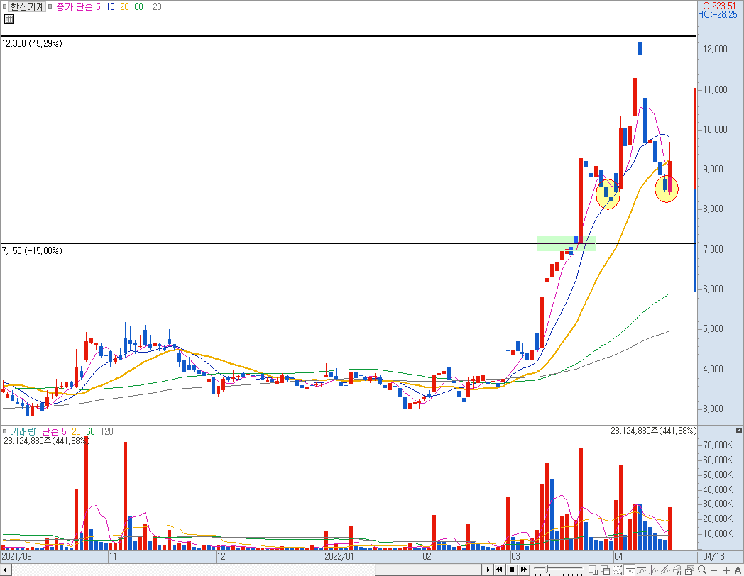 해당 부분은 매매를 할 때 최소한의 손절라인을 체크할 수 있는 기준이니 가볍게 참고해 주시기 바랍니다. 추가적으로 한신기계는 윤석열 후보의 탈원전 백지화 정책 관련주 중에서 대장주의 흐름을 보여주는 종목입니다.