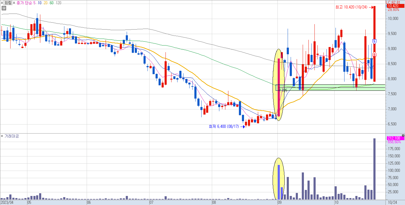 희림의 일봉 차트까지 함께 소개해드린 후 글을 마치겠습니다. 주가가 가파르게 상승했던 날과 종가 관리를 했던 날 차트 흐름이 어떠했는지 간단하게 체크해 보시기 바랍니다.