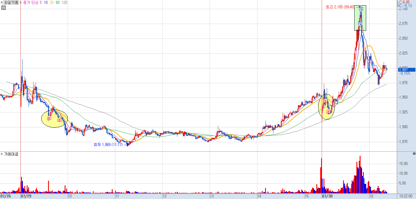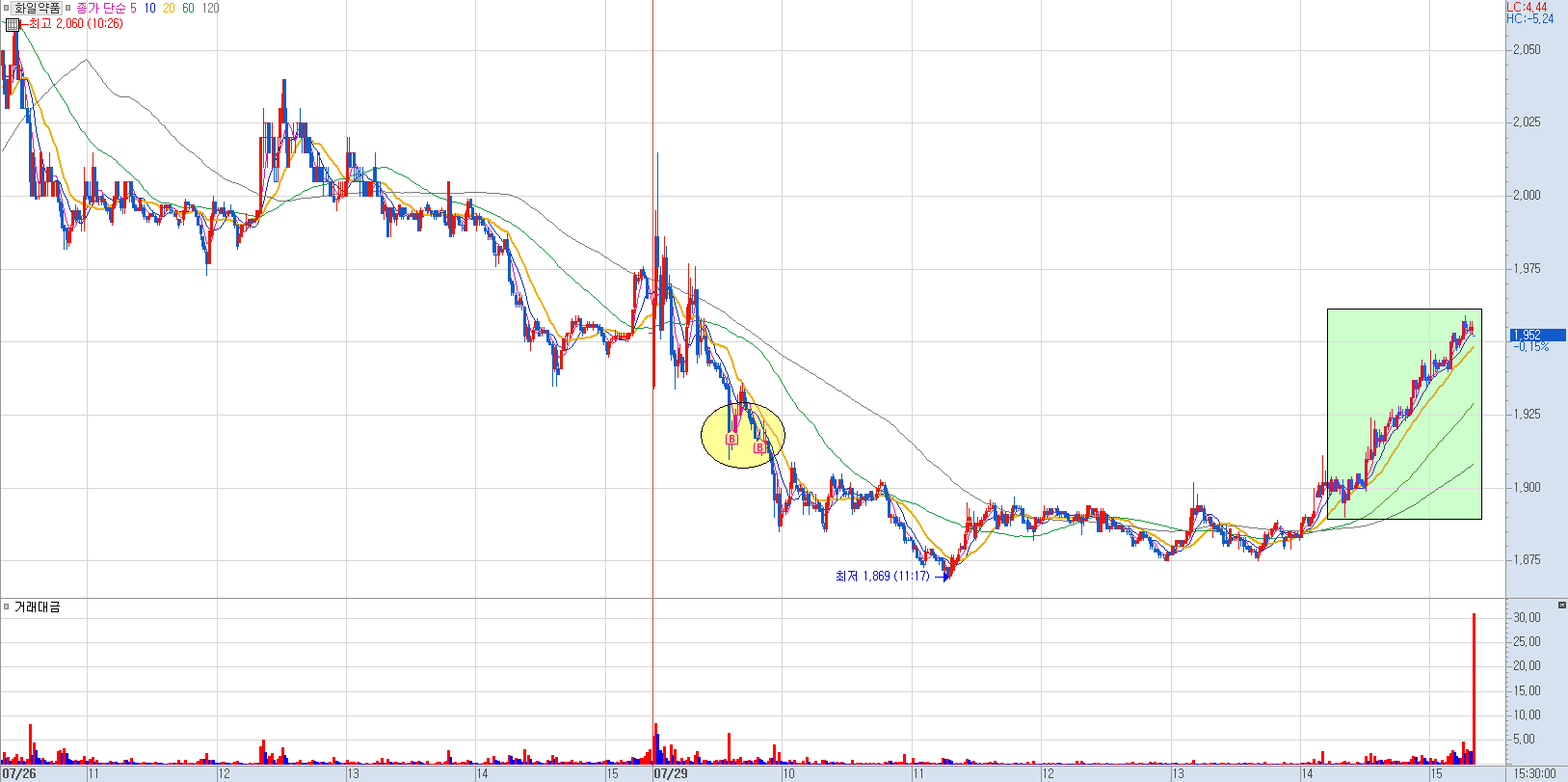 화일약품의 일봉 차트를 보시면 약 1500억 이상의 거래대금이 발생하면서 기준봉이 출현했고, 이후 고점을 한번 경신한 뒤 단기적으로 조정받는 흐름이 나타난 모습을 확인하실 수 있습니다.