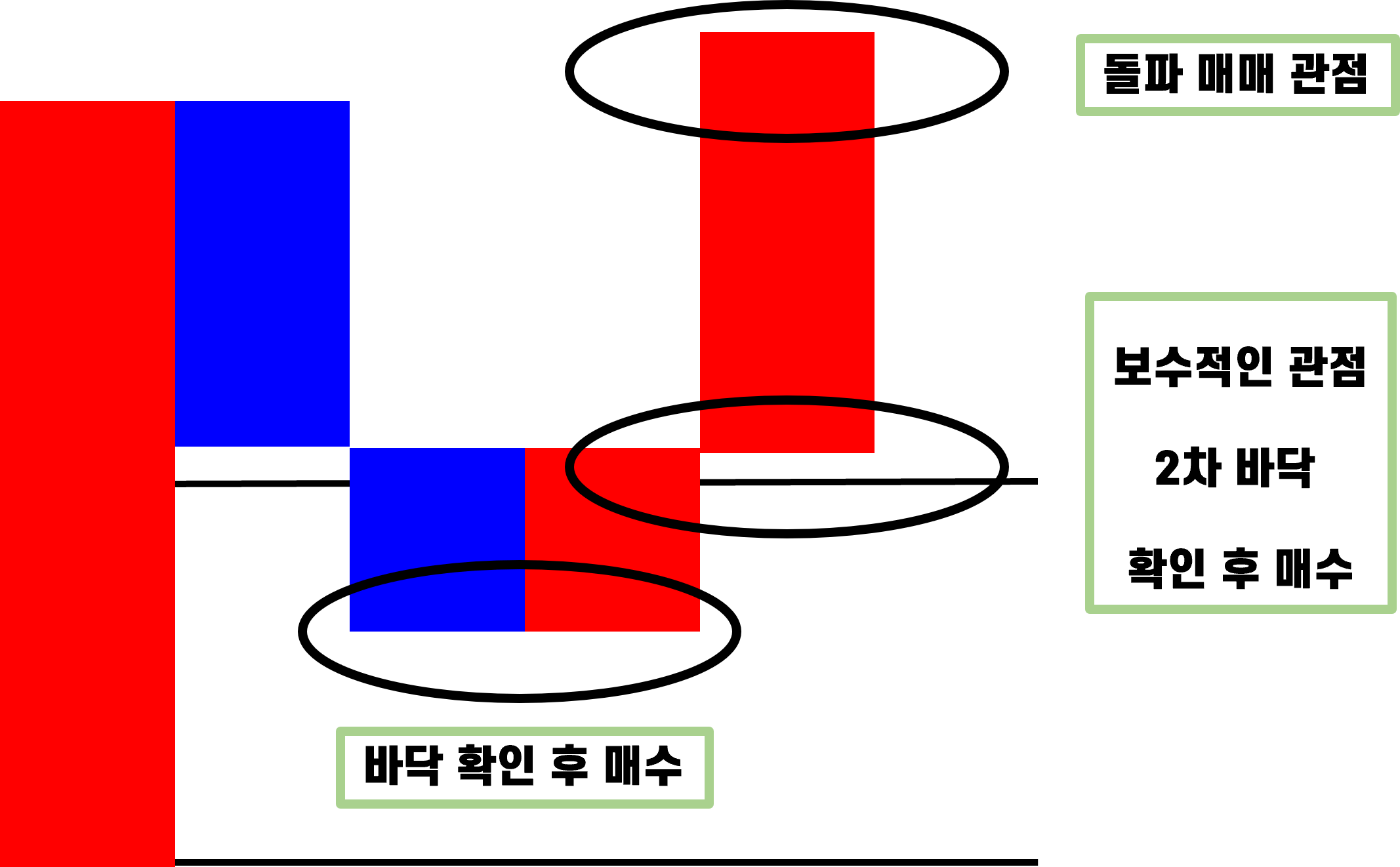 2. 세력들이 매집을 멈추었을 때 주가는 가격 조정 ~ 기간 조정을 받으면서 하락한다고 했다. 그럼 이때 우리는 기준봉의 의미 있는 가격인 기준봉의 종가, 기준봉의 중심, 기준봉의 시가를 기준으로 잡고 분할 매수로 종목을 매수할 수 있다. 여기서 기준봉의 종가를 이용한 매매는 기준봉 패턴 매매가 아니라 고점 횡보 패턴 매매이기 때문에 따로 다룰 것이다.