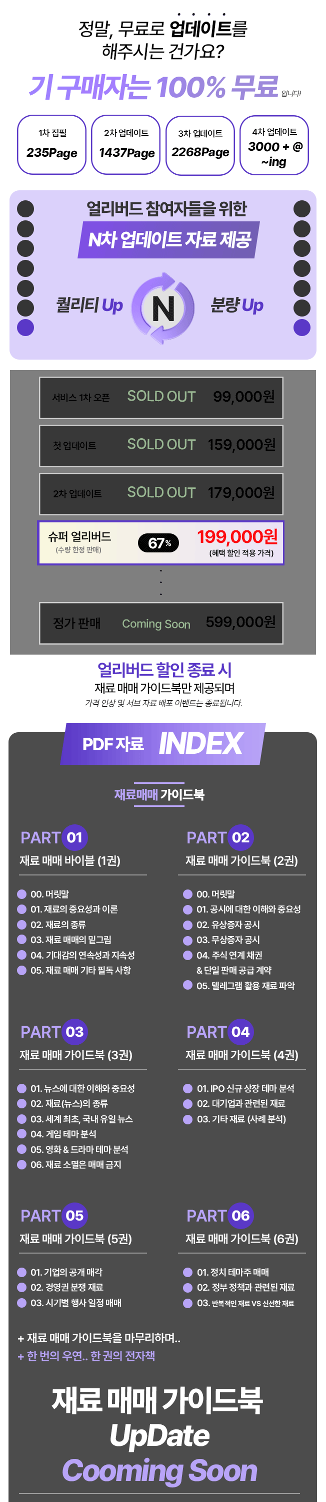 재료 매매 가이드북은 현재 추가 업데이트가 진행중이지만 그 분량이 너무 방대하여 정확한 기간이나 날짜를 알려드리기 어렵습니다. 대략 2000 페이지 정도의 추가 업데이트가 진행되고 있으며 어느 정도 윤곽이 잡혔을 때 구체적인 일정과 세부 내용을 공개할 예정입니다.