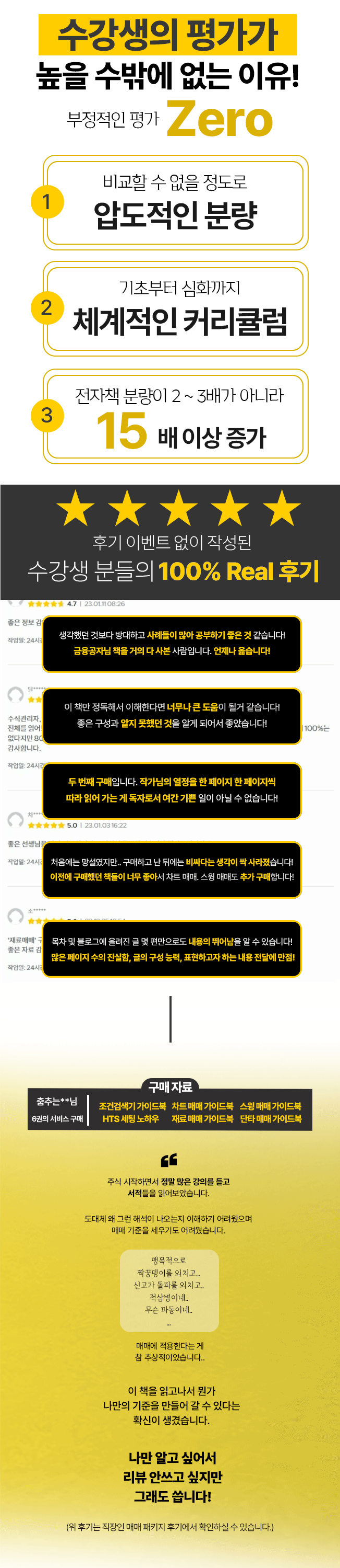 차트 매매 가이드북은 2024년 하반기부터 재료 & 스윙 매매 가이드북과 함께 대규모 업데이트가 시작될 예정이며 업데이트가 완료되는 대로 기 구매자분들께 순차적으로 발송해드릴 예정입니다. 페이지 수나 분량은 아직 구체적으로 확정되지 않았으며 큰 틀만 잡아둔 상황입니다.