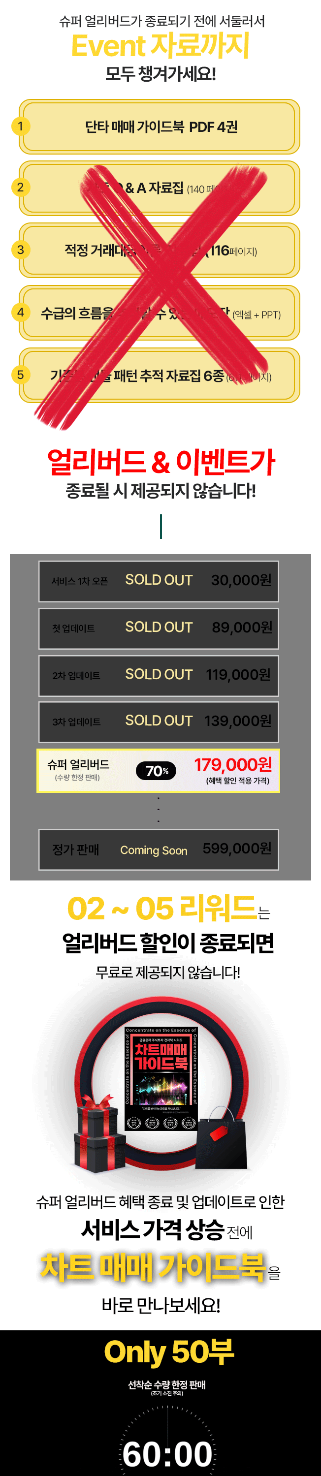 차트 매매 가이드북을 포함한 다수 전자책의 얼리버드 할인이 시작되었으며 얼리버드 할인이 종료되면 동시에 부가 자료 배포 이벤트로 함께 종료될 예정입니다. 이 부분에 대한 자세한 내용은 상세페이지를 통해 확인해주시기 바랍니다.