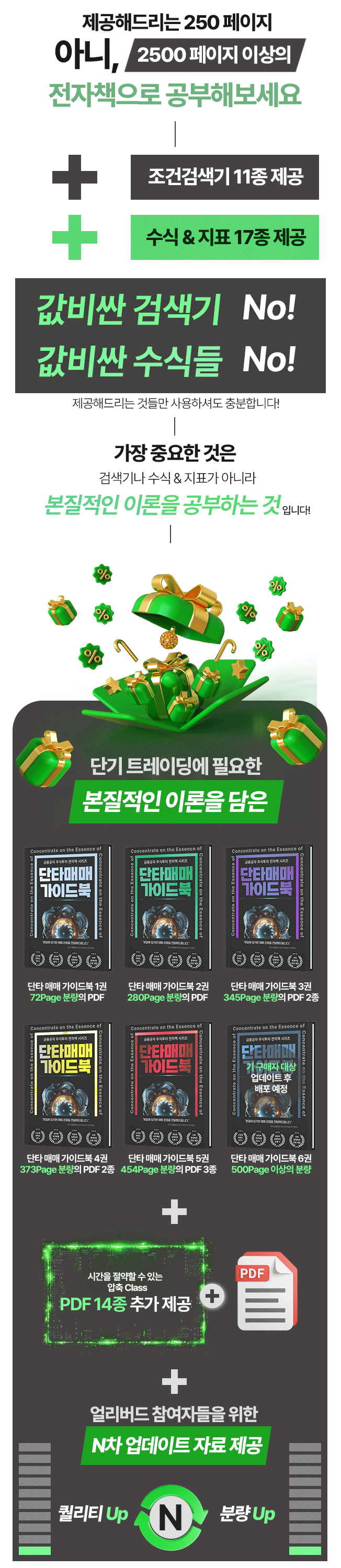 단타 매매 가이드북은 2024년 상반기 ~ 하반기 내 2번 정도의 추가적인 업데이트가 예정되어 있으며 얼리버드 참여자에게는 모든 자료가 무료로 제공되니 관련된 내용을 꼭 확인해주시기 바랍니다.