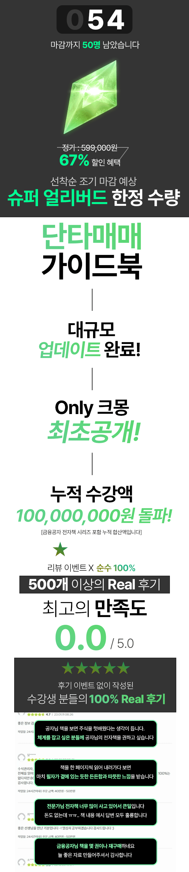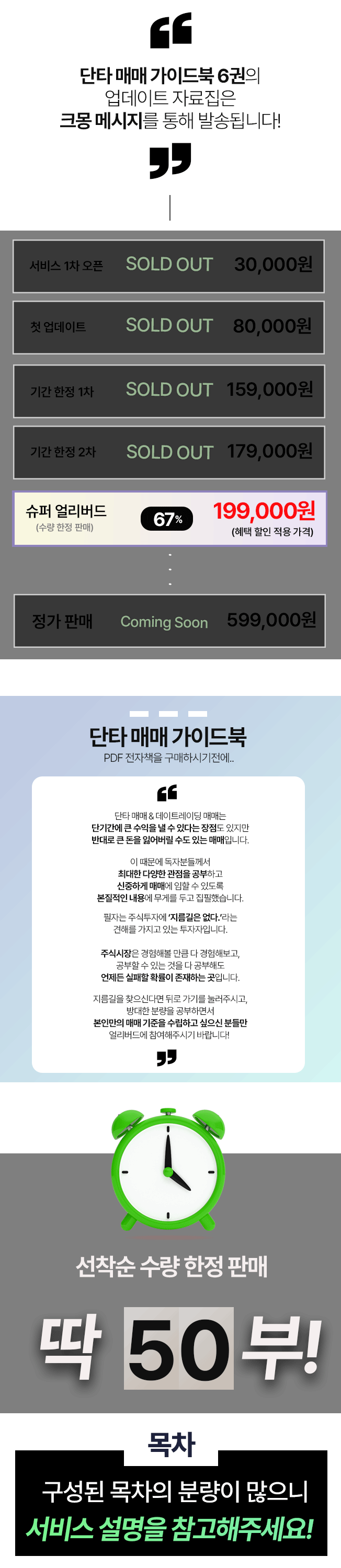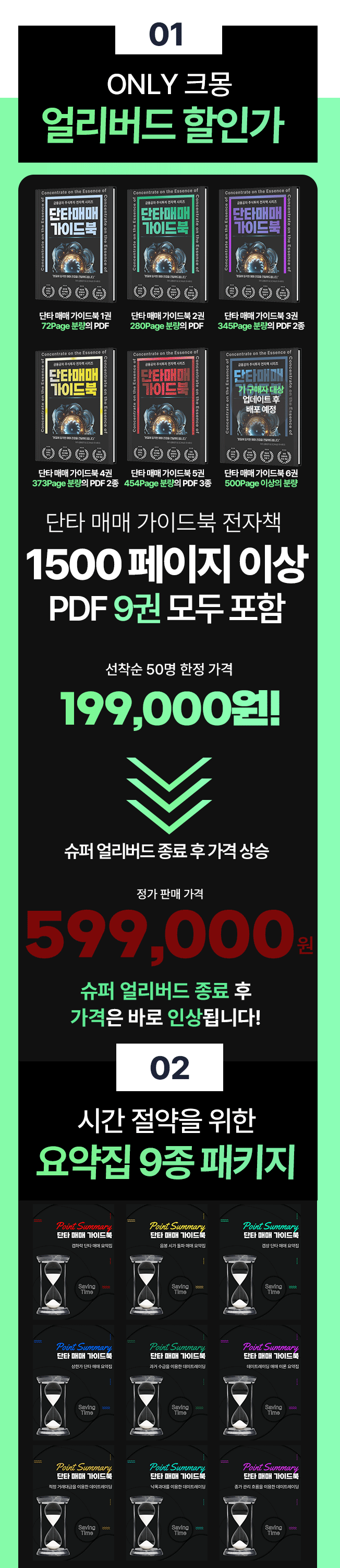 단타 매매 가이드북은 향후 3000 ~ 4000 페이지 이상의 분량으로 내용이 확대될 예정이기 때문에 N차 얼리버드 할인이 진행되며 얼리버드가 종료되면 가격은 순차적으로 인상됩니다. 관련된 내용은 하단 상세페이지를 확인해주세요!